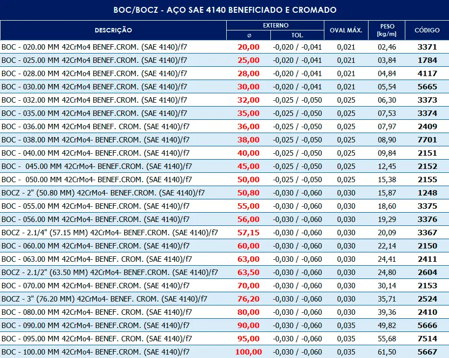 - Diâmetro < 60mm de 5.600 a 6.200mm