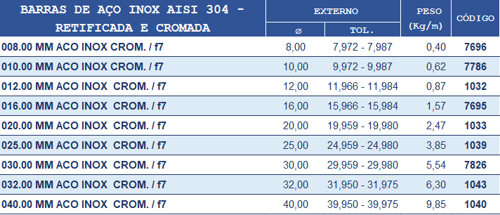2.0 - Faixa Diâmetros Disponíveis: 8mm até 40mm